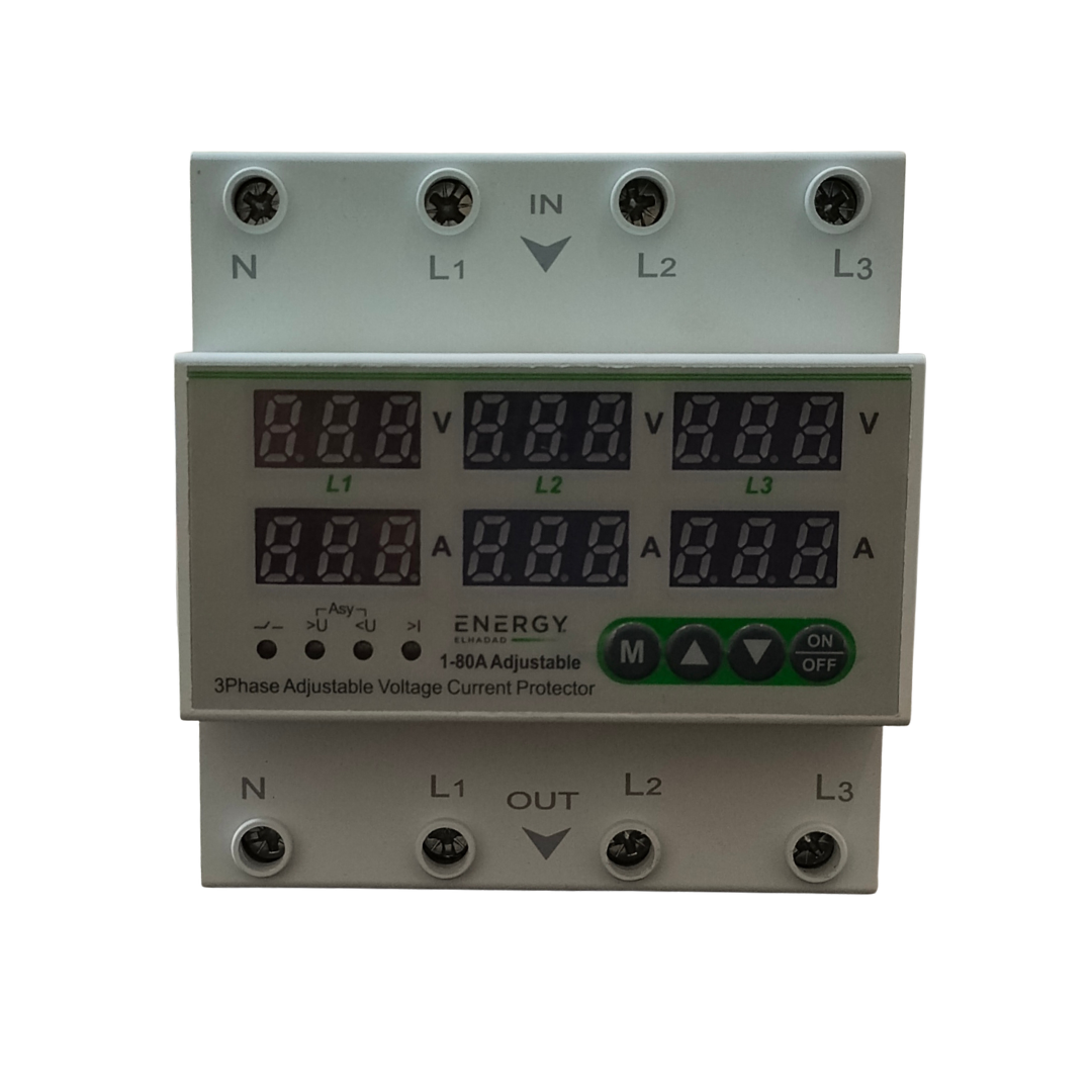 جهاز حماية منزلي رقمي (80A)3 فاز ، حماية من ارتفاع وانخفاض الجهد والتيار (Over/Under Voltage & Current Protector)، مع شاشة عرض، إعادة تشغيل تلقائي لـ 230V، قاطع فولت ديجيتال، 3 Phase من شركة انيرجي